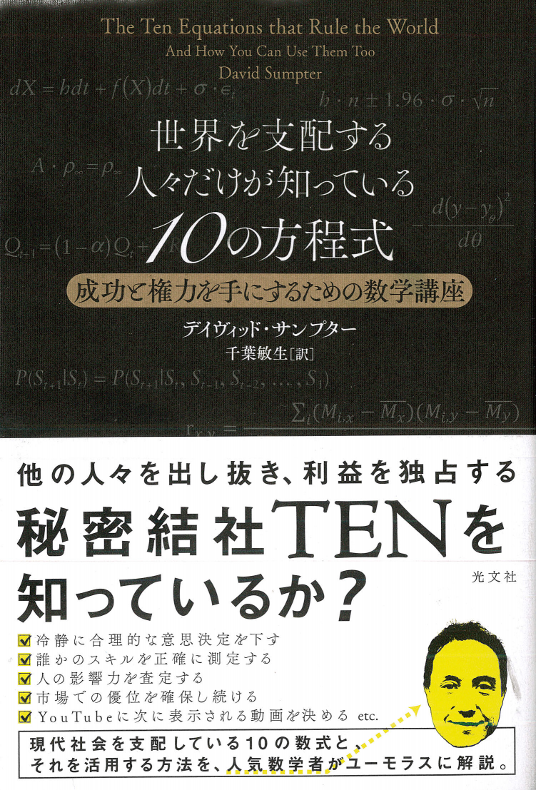 ![]() | デイヴィッド・サンプター著、千葉敏生訳 統計とか数学とか得意なわけではないし、世界を支配したいと思っているわけでもないけれど、数学的思考、統計的思考の基本をわかりやすく教えてくれる本で、編集していて勉強になりました。『因果推論の科学』『人はどこまで合理的か』のような本に興味がある方におすすめ。(T) |
