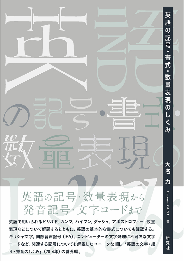 ![]() | 大名力著 (研究社) 古巣の研究社時代に企画した本。2014年刊行の『英語の文字・綴り・発音のしくみ』の番外編。 ピリオド、コンマ、ハイフン、ダッシュなどの記号やギリシャ文字、国際音声記号(IPA)、文字コードなどについて解説した本。この種の本はルールブックの形式になっていることが多いが、大名先生の常として、ポイントは「なぜそうなるか」を解説することだ。装幀は金子泰明さん。いつもながらカバーの文字に仕掛けがある。(T) |